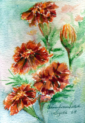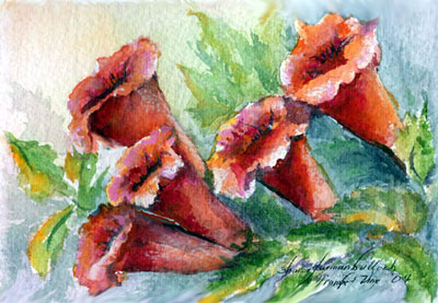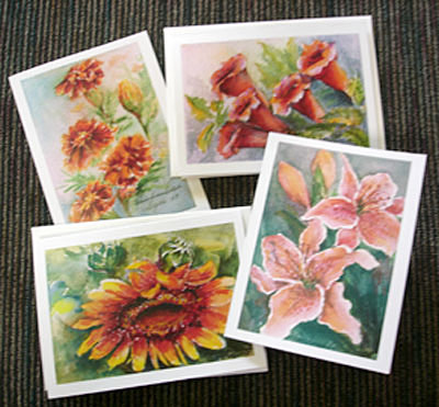 These 8 blank greeting cards are size 4 1/2” X 6” and come with 8 white envelopes in a nice self-sealing clear acetate bag. If a clear acetate box is preferred just let me know. Each card is printed on 110 lb white card stock and is a reproduction of my original watercolor painting. The Summer II Flower Collection Set contains two cards each of the following images: Marigold, Stargazer Lily, Sunflower, and Trumpet Vine. This set is $10 and is available at my Etsy Store. |
